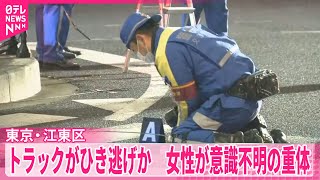 東京・江東区の豊洲市場前の横断歩道で、20代女性がトラックにはねられ意識不明の重体となった事故。ひき逃げの可能性もあり、運転手の男が逮捕されたとの情報もある。 pedestrians の安全が問われている。